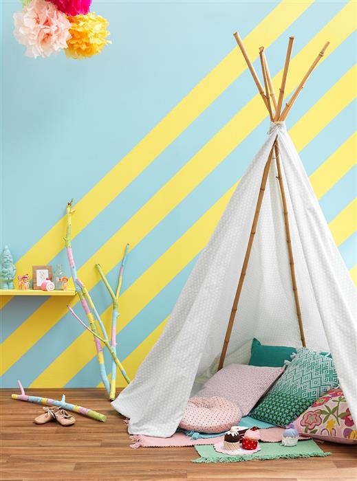 Chambre d'enfant aux couleurs pastels qui se mélangent dans une décoration joyeuse appelant au jeu et à la créativité.