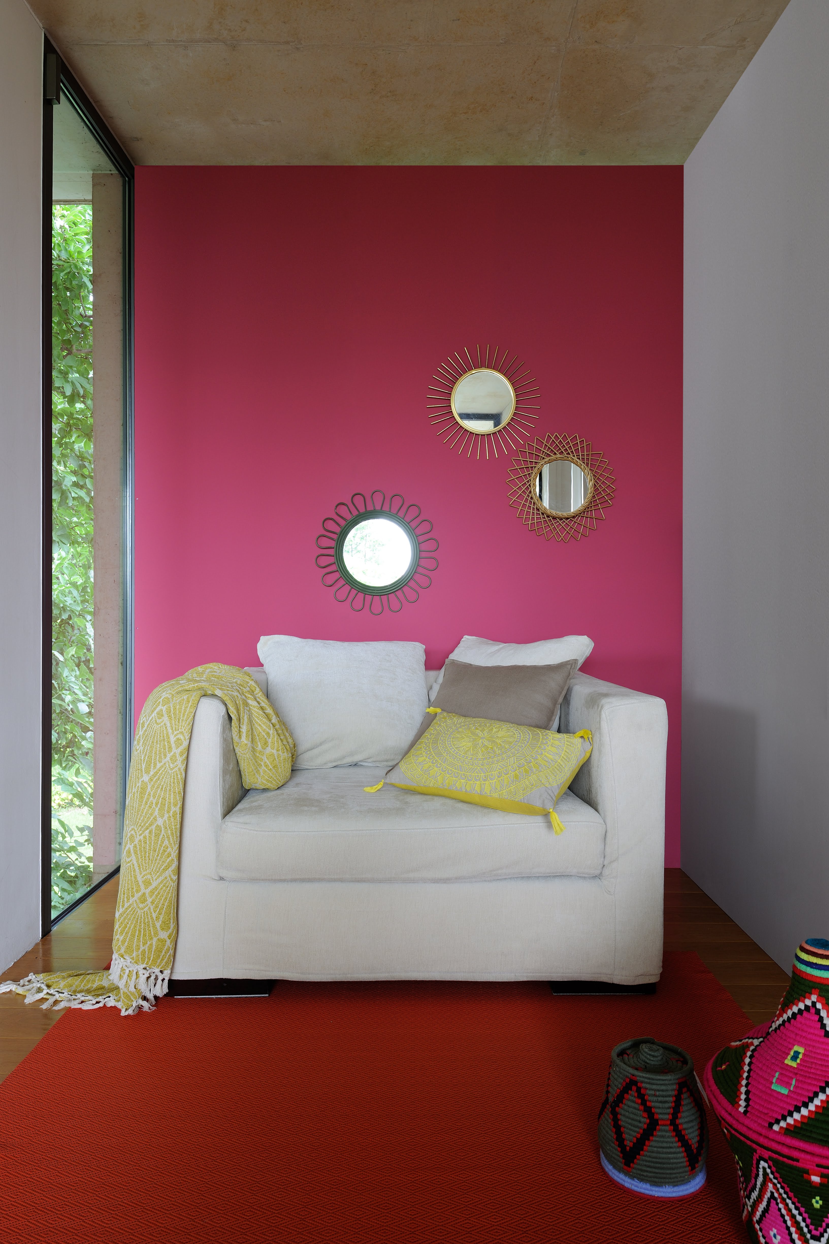 Salon tout en gaieté en mêlant des couleurs gris et rouge.